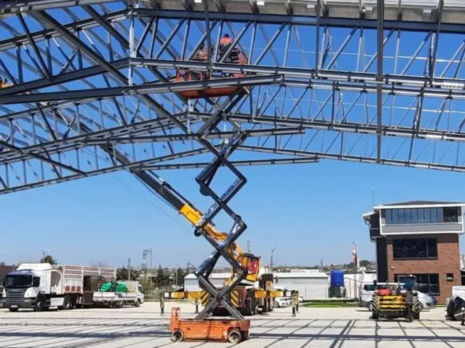 De stalen onderdelen van het magazijn, waaronder balken, kolommen, schoren en dakspanten, worden in een fabrieksomgeving geprefabriceerd uit hoogwaardig staal. De componenten zijn vervaardigd volgens nauwkeurige specificaties, zodat ze tijdens de installatie nauwkeurig en veilig in elkaar passen.