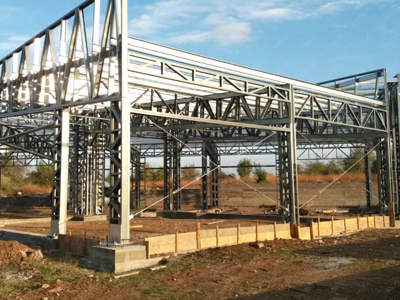 4. Installatie van de staalconstructie De geprefabriceerde stalen componenten worden naar de bouwplaats getransporteerd en geassembleerd met behulp van kranen en ander zwaar materieel. Het installatieproces begint met het oprichten en verankeren van de kolommen aan de fundering, gevolgd door het installeren van balken om het magazijnframe te vormen. Vervolgens worden dakspanten vastgezet om het dakbedekkingssysteem te ondersteunen.