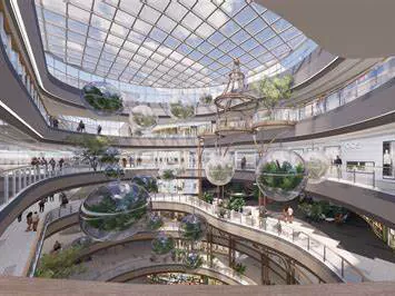Japanse Fukaya Garden Outlets Shopping Center: met een stalen structuur met een gedeeltelijk ontwerp met twee verdiepingen, de buitenmuren van het gebouw presenteren een geplooide uiterlijk zoals Origami, waardoor het een onderscheidend kenmerk van het winkelcentrum is. Het food court bevindt zich op de tweede verdieping en biedt een dubbel uitzicht op het winkelcentrum en de verre bergen.